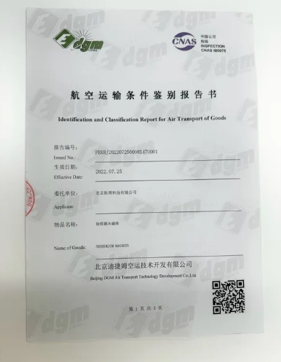 承运磁性材料的航空公司或物流公司都会要强求客户做磁性检测,出具《航空运输条件鉴别报告书》,以便保证飞机的正常飞行。空运鉴定一般只能由本国民航管理当局认可的有资质的专业鉴定公司出具,而且一般需要寄送样品给鉴定公司进行专业检测,然后出具鉴定报告。不方便寄送样品的,就由鉴定公司的专业人员进行现场检测,然后出具鉴定报告。鉴定报告的有效期一般本年度使用,跨年之后,一般要重新做。